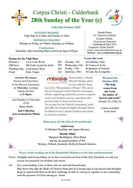 Next Sunday is World Mission Sunday when we are called by Pope Leo to be “Missionaries of Hope”. We can do this by being part of the Church’s missionary efforts, supporting missionary priests, religious sisters and brothers, and lay catechists who provide hope to those most in need.