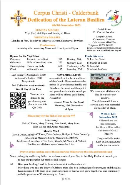 Kevin Dolan, Isabella O’Rawe, Peter Crainey, Bridget & Peter Donnelly, Pat, John & Margaret Smith, Margaret McMahon, the deceased members of the Irons, Woods, McManus, & Valenti families and all those in our November Lists.